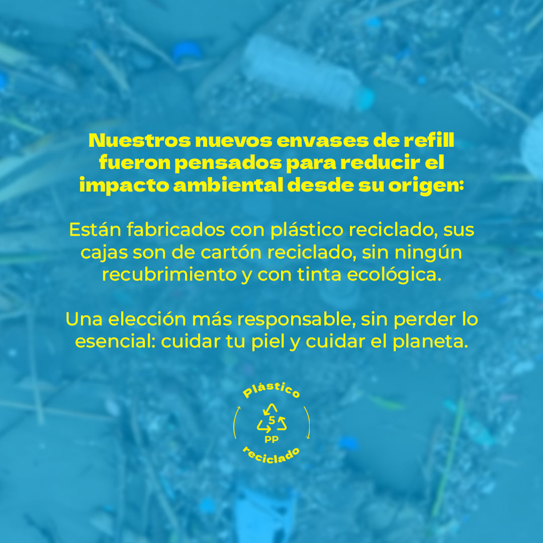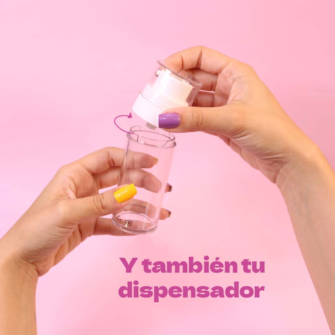 Solo necesitas adquirir una vez el envase refill (el dispensador reutilizable) y luego reemplazar el interior con nuestros refills, que generan menos residuos y reducen el costo de tus próximas compras.