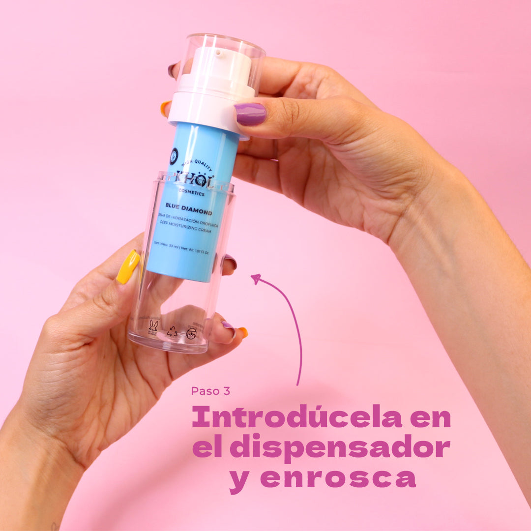 Este es el refill (recambio) de nuestros productos de la línea dermatológica, diseñado para insertarse dentro del envase dispensador reutilizable. Con este sistema, solo reemplazas el interior del envase cuando el producto se termine, lo que te permite reducir residuos y ahorrar en cada reposición.